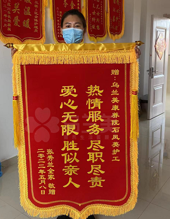 近日,烏蘭美康養(yǎng)院收到了一封致謝院內(nèi)全體工作人員的感謝信和一面送給石鳳英護(hù)理員的錦旗,錦旗上面寫(xiě)著“熱心服務(wù),盡職盡責(zé),愛(ài)心無(wú)限,勝似親人”。一句感謝的話語(yǔ),一面肯定的錦旗都承載了老人家屬對(duì)我們服務(wù)的認(rèn)可,讓我們更有一種責(zé)任感和使命感要把這份工作做好。